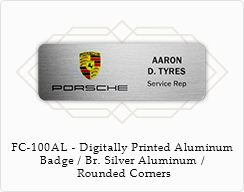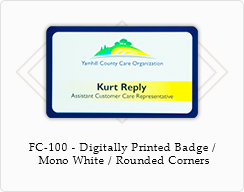 Our most popular product, item FC-100 is a fully digitally printed badge. This means the sky is the limit. We can use any font and print in most any color. This scratch resistant badge is digitally printed on white material and features a UV protective surface.